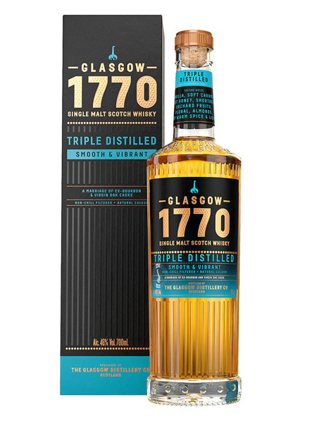 Le 1770 Glasgow Triple Distilled est un whisky proposé par la distillerie Glasgow située dans la ville éponyme. Ce whisky non-tourbé a été élaboré via une triple distillation en alambic à repasse. Il a ensuite été vieilli dans des fûts de bourbon neufs et de premier remplissage. La finition a eu lieu dans des fûts de bourbon neufs et de second remplissage. Le 1770 Glasgow Triple Distilled est un whisky écossais qui manie douceur et sécheresse avec aisance.