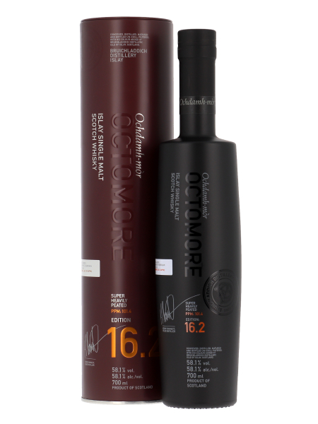 Octomore 16.2 est une édition de la distillerie Bruichladdich Distillery sur l’île d’Islay (Écosse). Distillé à partir d’orge 100 % écossaise (variété Concerto) maltée à 101,4 ppm de phénols, un des plus hauts niveaux de tourbe au monde, il affirme son caractère radical. Pour adoucir et enrichir ce profil extrême, le whisky a vieilli d’abord en fûts de sherry Oloroso et de vins de Bordeaux pendant quatre ans, puis a bénéficié d’un finition d’un an en fûts de Madère et de Moscatel. Embouteillé à 58,1 % vol., non filtré à froid et sans ajout de colorant, Octomore 16.2 incarne la quintessence du style « super tourbé » : intense, complexe, et audacieusement structuré.