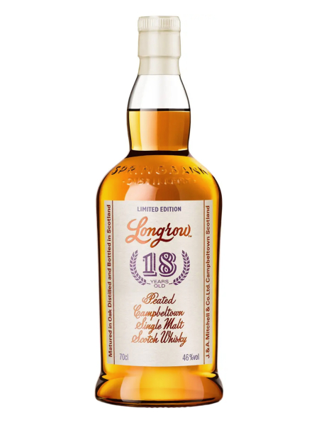 Produit non-éligible aux promotions. Le Longrow 18 ans est une édition limitée annuelle produit au sein de la distillerie Springbank. Version très tourbée de la maison, Longrow connaît un séchage à la tourbe de 48 heures. Cette version embouteillée en 2024, propose un mix entre une maturation en fûts de sherry (90%) et en fûts de porto (10%).